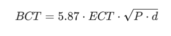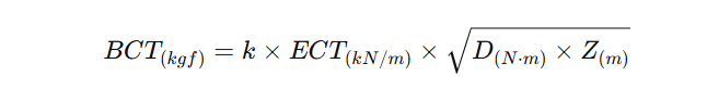 Em que k é uma constante empírica (geralmente entre 0,9 e 1,1, dependendo do tipo de ondulado). Mas, na prática, muitos fabricantes utilizam a versão simplificada com base no ECT e no perímetro:
